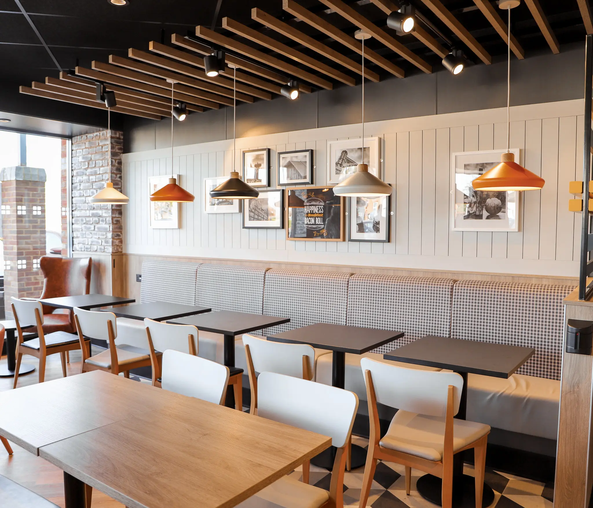 Depuis plus de dix ans, nous créons pour Greggs des meubles aussi fiables qu'accueillants. Tout comme Greggs estime que tout le monde mérite des aliments fraîchement préparés et savoureux, nous pensons que chaque siège, chaque table et chaque détail doivent être conçus pour durer et adaptés à tous ceux qui franchissent la porte.