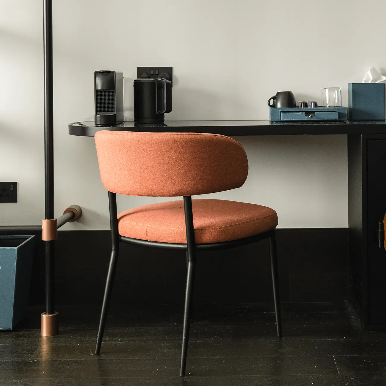 The Camden Side Chair offers a sculpted, wraparound back with a generously upholstered seat, delivering assured comfort with refined presence.