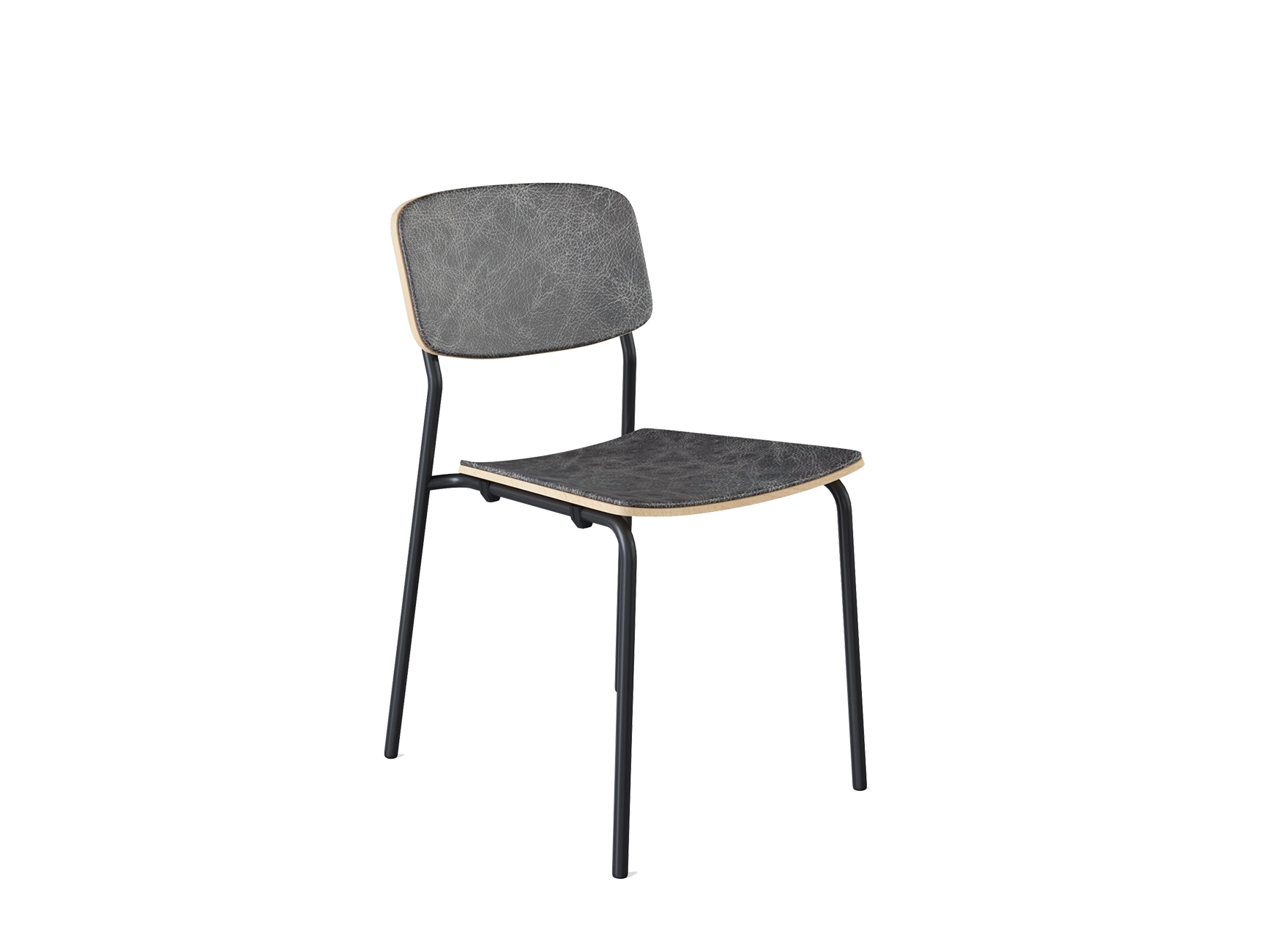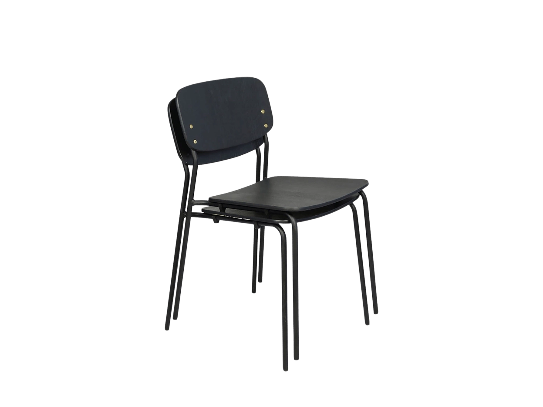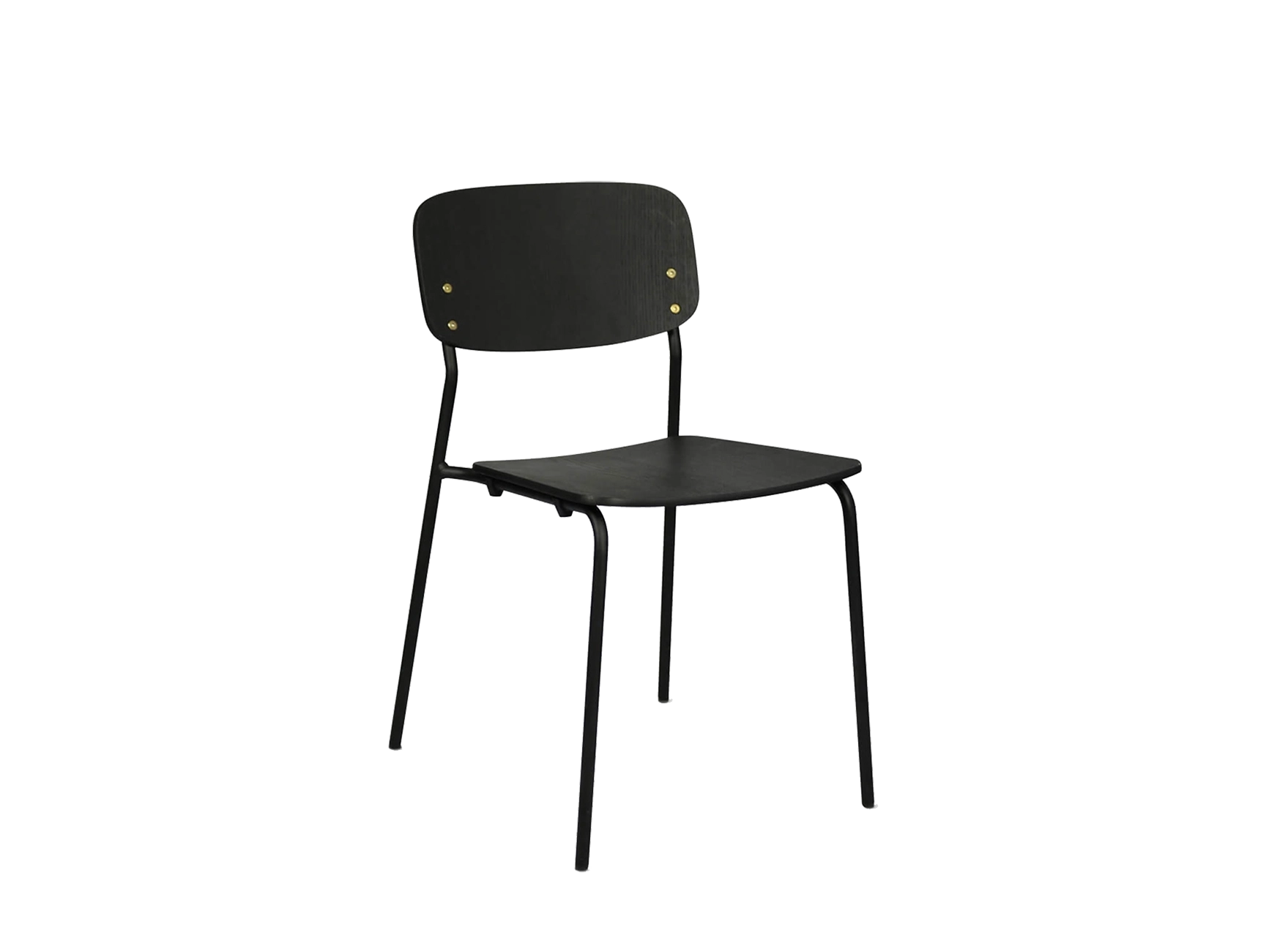 An industrial-inspired stackable dining chair with an open and minimal silhouette. Available with a wooden or upholstered seat and a slim metal frame that comes with nylon glides as standard to protect flooring.