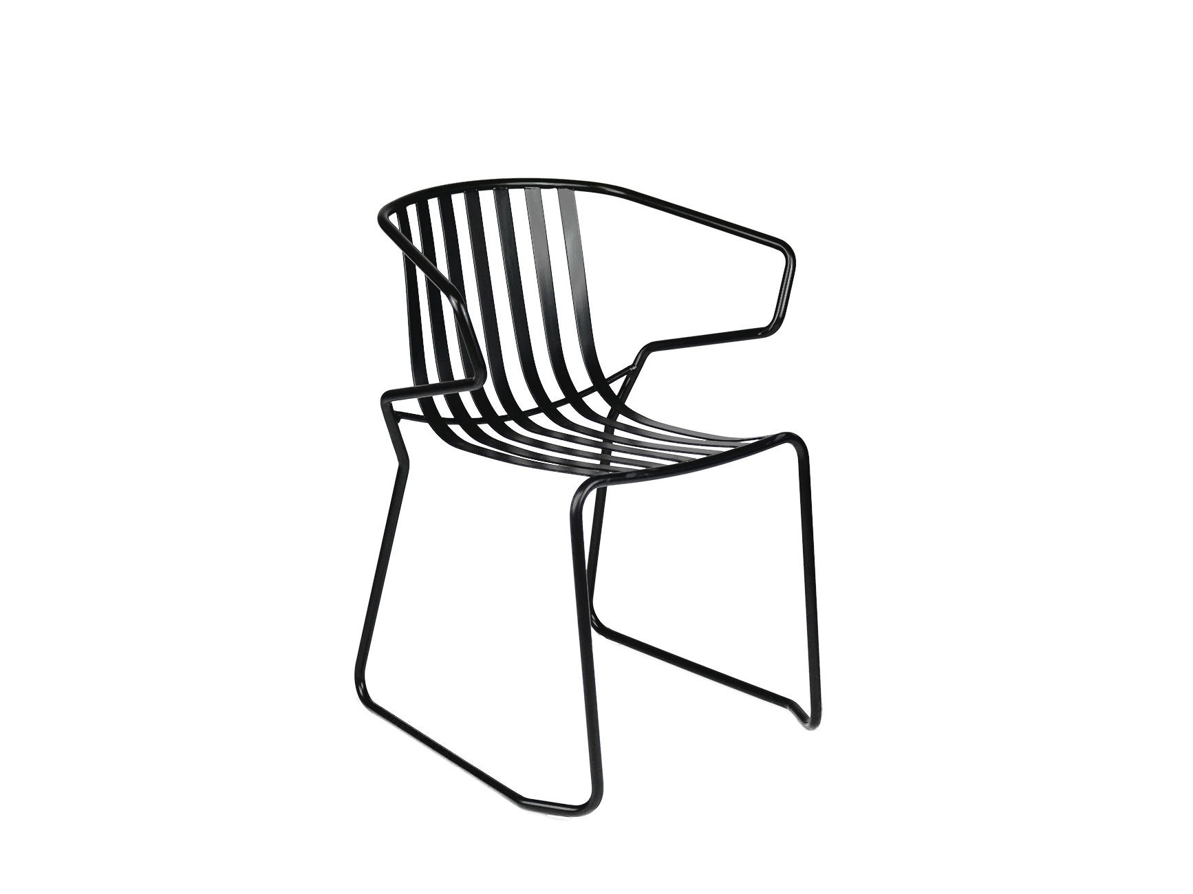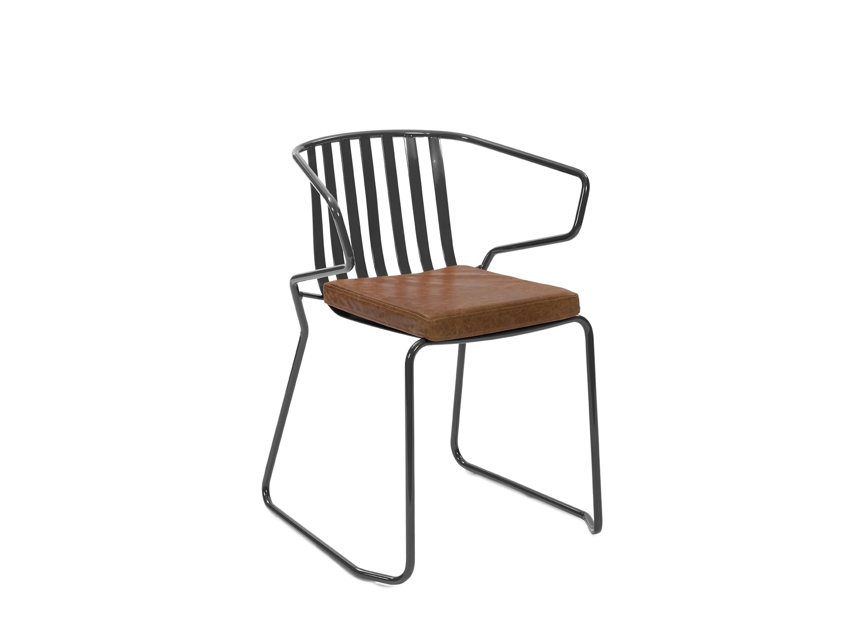 A metal framed outdoor dining chair with arms and an optional seat cushion. The galvanised, powder-coated metal frame can be specified in any RAL colour and the loose upholstered seat pad comes in any standard fabric, as well as faux leather. Suitable for use both indoors and out.